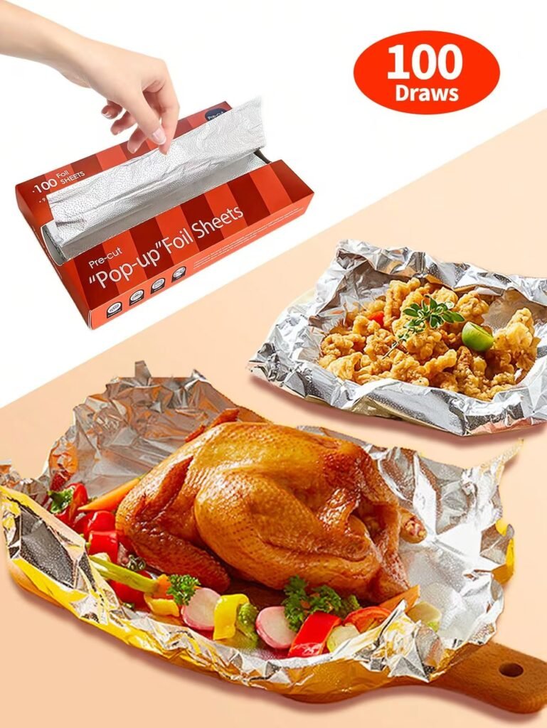Different from traditional rolled aluminum foil, Pop-up foil is pre-cut just like the dispensing paper, more easy for cooking while your hands are busy with stirring the sauce.