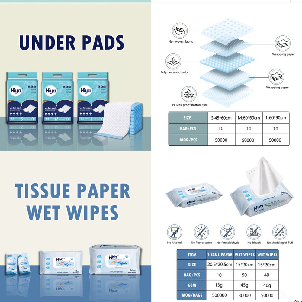 Here we help our clients to source and export the custom Under pads, Tissue paper wet wipes, please contact us for more information.